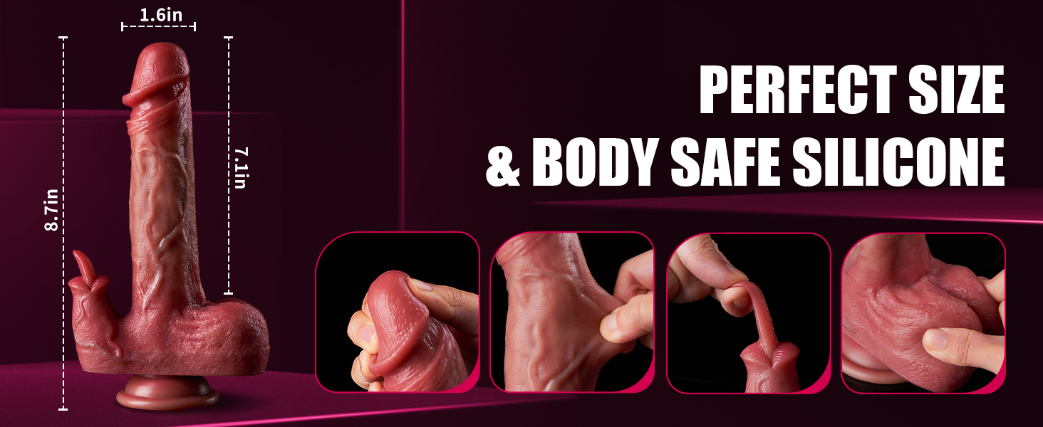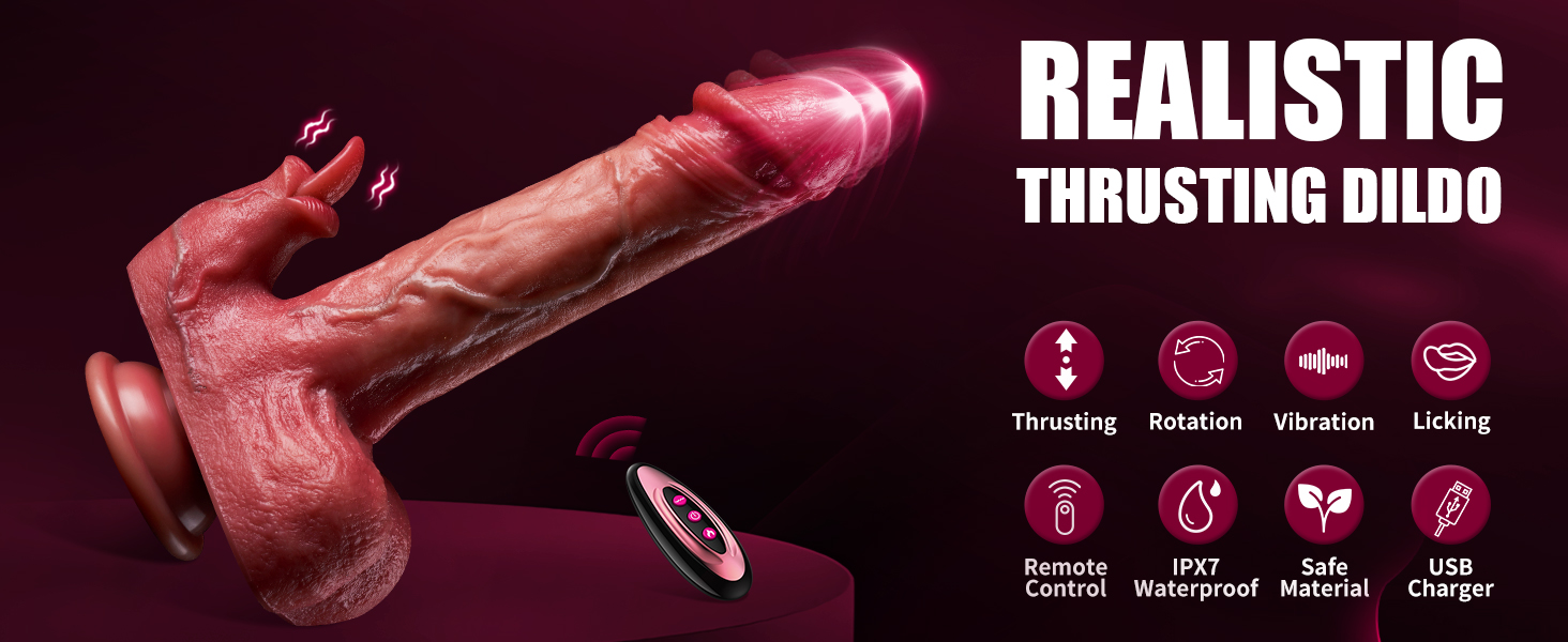 - 【Ultra Realistic Dildo Vibrator】This 8.7'' g-spot thrusting dildo vibrator features a close to real skin design, with lifelike glans, vivid veins, natural balls, flexible little tongue and real soft texture give this dildo an incredibly realistic feel.And this vibrating dildo had 7.1 inches insert length that can satisfy your desire to be filled.