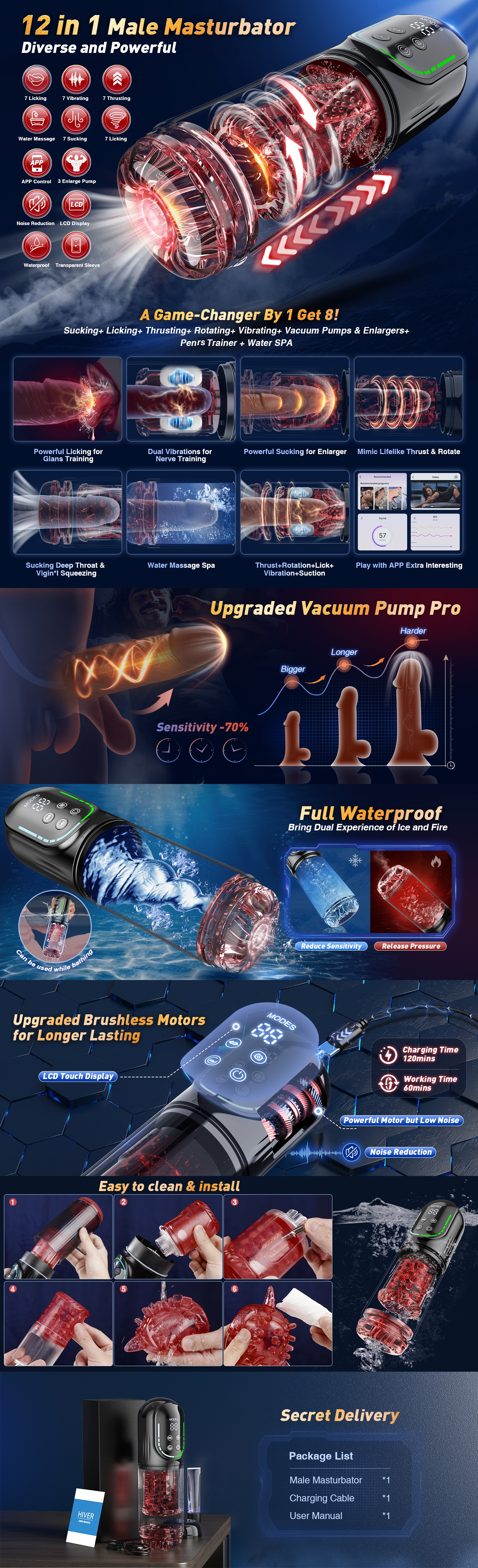 • Multifunctional Pleasure Machine: Combines thrusting, rotating, sucking, licking, vibrating, vacuum pumping, penis training, and waterproof spa massage—an all-rounder for ultimate stimulation.